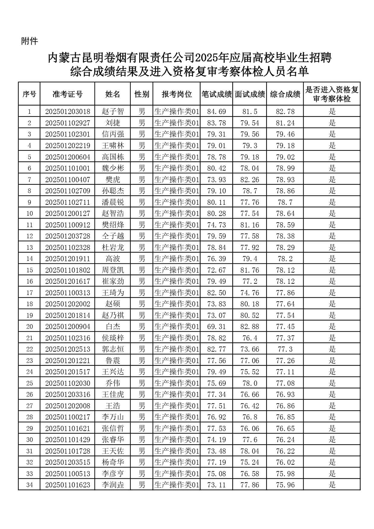 附件:內(nèi)蒙古昆明卷煙有限責(zé)任公司2025年應(yīng)屆高校畢業(yè)生招聘綜合成績(jī)結(jié)果及進(jìn)入資格復(fù)審考察體檢人員名單